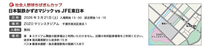 3月21日(土)にZOZOマリンスタジアムにて「社会人野球ちばぎんカップ JFE東日本vs日本製鉄かずさマジック」が開催されることとなりました。